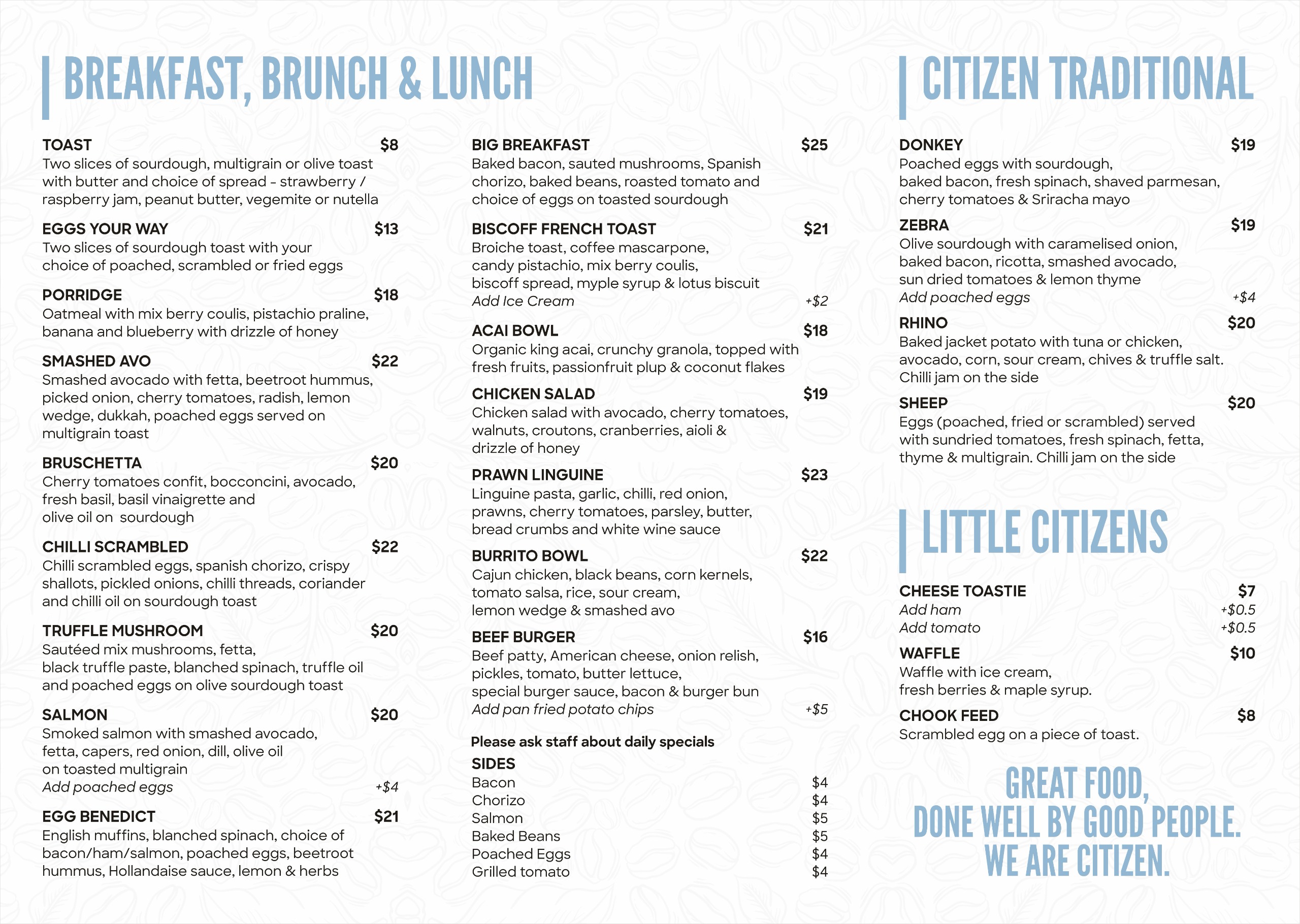 Chris McCall2025-07-14Trustindex verifies that the original source of the review is Google. Thought that we would try the new menu selection and was not disappointed. Great atmosphere, without the Brighton Tax Dennis Achtypis2025-06-25Trustindex verifies that the original source of the review is Google. Citizen Cafe is our Monday and Friday go to cafe stop. The owners and staff are very friendly and welcoming and were kind enough to sponsor us via a winter cycling jersey which we are very grateful for and wear proudly on those 2 days of the week. Great coffee, great food menu and great service. Highly recommended by our riding group. Richard Passey2025-03-18Trustindex verifies that the original source of the review is Google. Great food and coffee Jessica Polaccov2025-03-01Trustindex verifies that the original source of the review is Google. Went for breakfast here this morning was overwhelmed by the atmosphere clean dining, excellent friendly service and great quality food and prices will definitely be returning. Thank you โบ๏ธ Citizen Cafe Jasmin Edmond2025-02-19Trustindex verifies that the original source of the review is Google. I live around the corner and canโt believe Iโve never come here before!!!! I came in right before close and the staff were so friendly. The coffee was so yummers ๐ definitely going to make Citizen my new coffee spot Gypsy Kim2025-02-13Trustindex verifies that the original source of the review is Google. I have only just discovered this little gem, awesome, friendly staff and they make an excellent coffee. lucy robertson2025-02-01Trustindex verifies that the original source of the review is Google. that new barista makes really good coffee! Ignatius Soputro2025-01-16Trustindex verifies that the original source of the review is Google. Citizen cafe has always been one of my favourite cafe for their delicious coffee. But to be honest I havenโt really tasted their food before, so I decided today is the day. Their food menu takes the name of animals. Whilst I find it cute, it makes it quite difficult to order quickly because you have to read the description for each of the food so you know what food they have available. In the end I chose Snow Goose which is a 3 mushroom dish. Presentation looks nice and simple, however I found the dish overall is too dry. The truffle oil must have been absorbed by the mushrooms. Also the 2 poached eggs were almost overcooked, with only a very tiny bit of yolk still runny. So at the end of the day, the coffee is great as always but the food is average. I havenโt to give 4 stars overall.Verified by TrustindexTrustindex verified badge is the Universal Symbol of Trust. Only the greatest companies can get the verified badge who has a review score above 4.5, based on customer reviews over the past 12 months. Read more